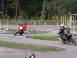 | 練習の仕方 自動車教習所のコースの中にパイロンで一周できるコースを設定して走りながら各自の課題に取り組みます。走行形式としてはミニ走行会のようなものです。コースの中に何箇所か抜かすポイントを設定するので速度やレベルの違う人がマイペースで走れます。初めての方でも安心です。 |